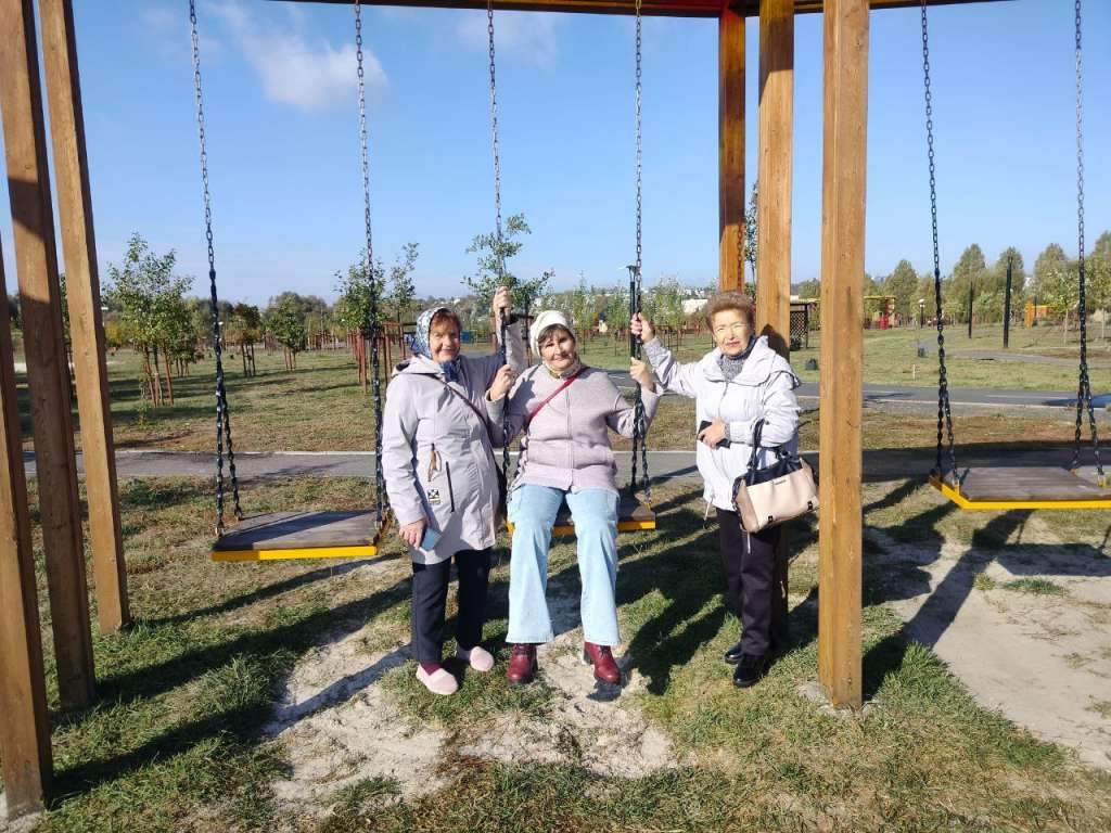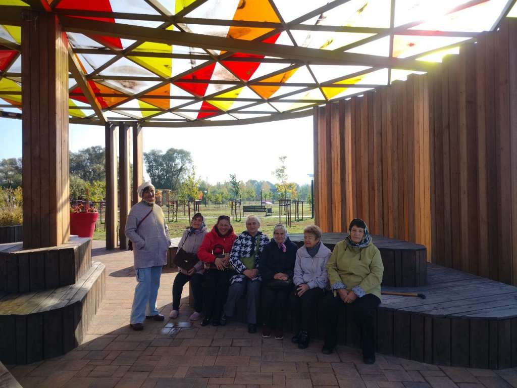 В осенний день погода радовала своим теплом, поэтому получатели социальных услуг с радостью прогулялись по обновлённому парку, в котором доступны спортивно-игровые площадки, телеэкран, новая набережная, теневые навесы, качели, велодорожки и многое другое.