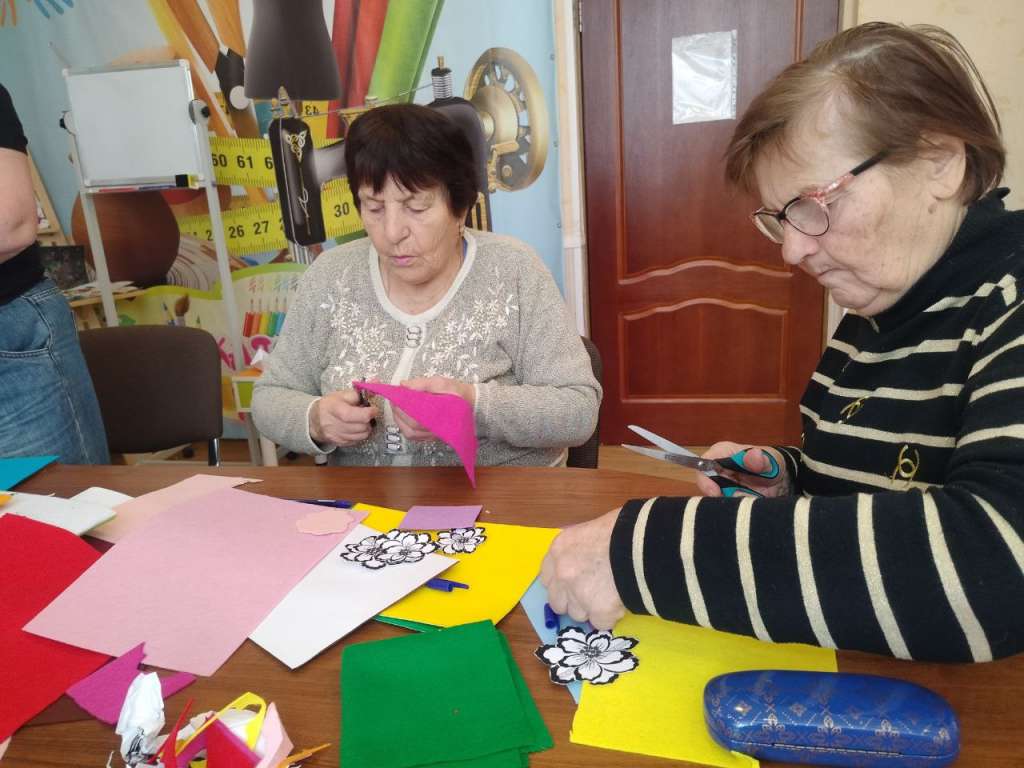 На занятии граждане старшего возраста под руководством специалиста комплексного центра социального обслуживания населения Корочанского района Нехайчик Светланы Вячеславовны выполнили аппликации из фетра с применением шва «вперёд иголку», применили навыки и приёмы разметки по шаблону и вырезанию по намеченным линиям, изготовили шаблоны выкройки лепестков и листочков, затем перенесли выкройки на фетр и вырезали их. В итоге у всех получились очень яркие и непохожие друг на друга аппликации.