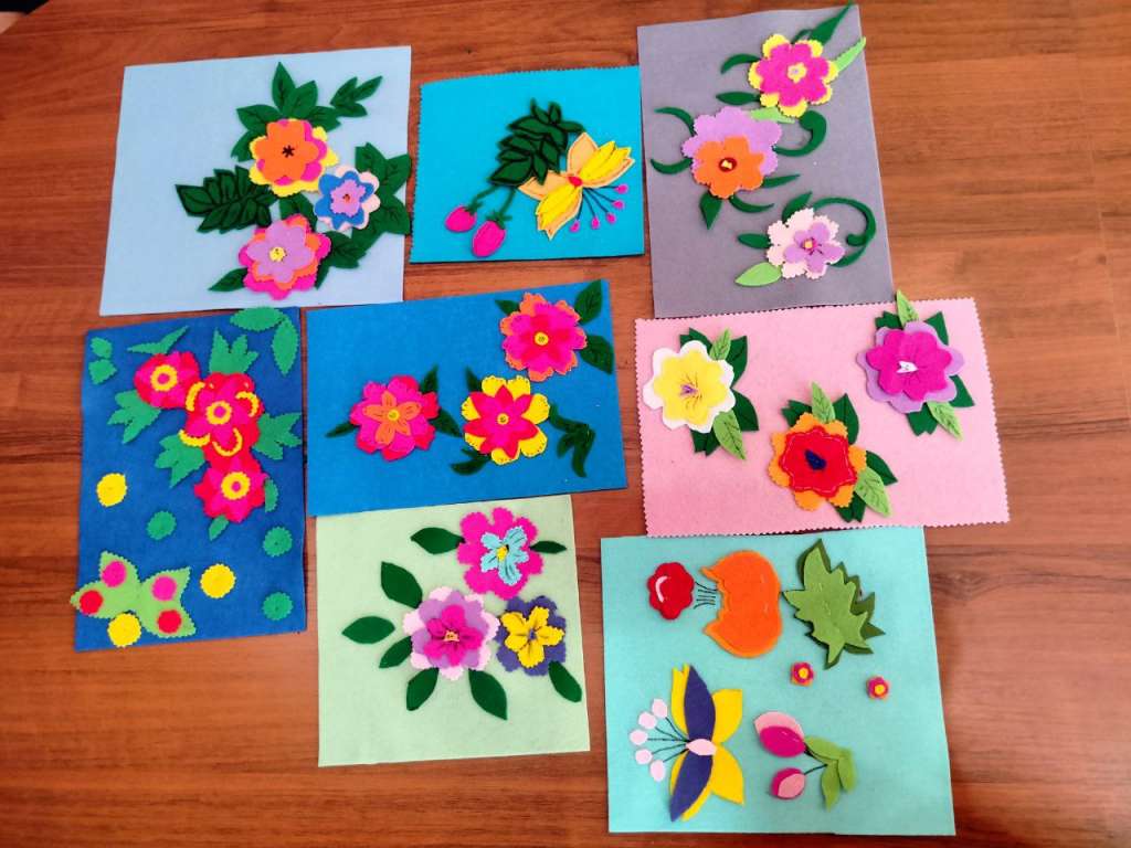 На занятии граждане старшего возраста под руководством специалиста комплексного центра социального обслуживания населения Корочанского района Нехайчик Светланы Вячеславовны выполнили аппликации из фетра с применением шва «вперёд иголку», применили навыки и приёмы разметки по шаблону и вырезанию по намеченным линиям, изготовили шаблоны выкройки лепестков и листочков, затем перенесли выкройки на фетр и вырезали их. В итоге у всех получились очень яркие и непохожие друг на друга аппликации.