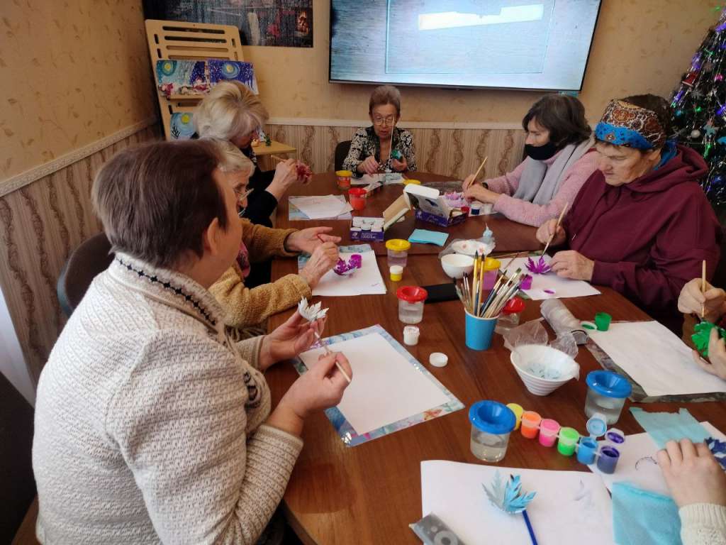 На первом этапе получатели социальных услуг делали заготовки для будущего подсвечника, а на втором этапе после высыхания заготовок участники раскрасили свои работы, используя основные «зимние» цвета.