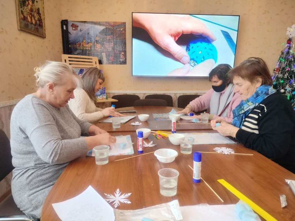 На первом этапе получатели социальных услуг делали заготовки для будущего подсвечника, а на втором этапе после высыхания заготовок участники раскрасили свои работы, используя основные «зимние» цвета.
